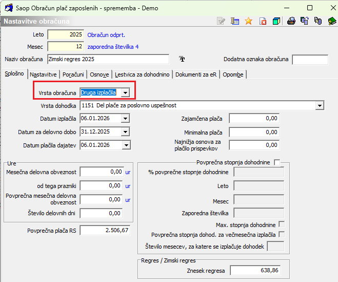 Preden izvedete obdelavo Obračunaj vse na obračunu Zimskega regresa spremenite nastavitev pri podatku Vrsta obračuna iz Regresa na Druga izplačila.