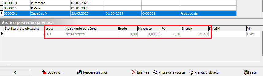 V nadaljevanju z ukaznim gumbom Prenos v obračun prenesete podatke iz Posrednega vnosa v Neposredni vnos.