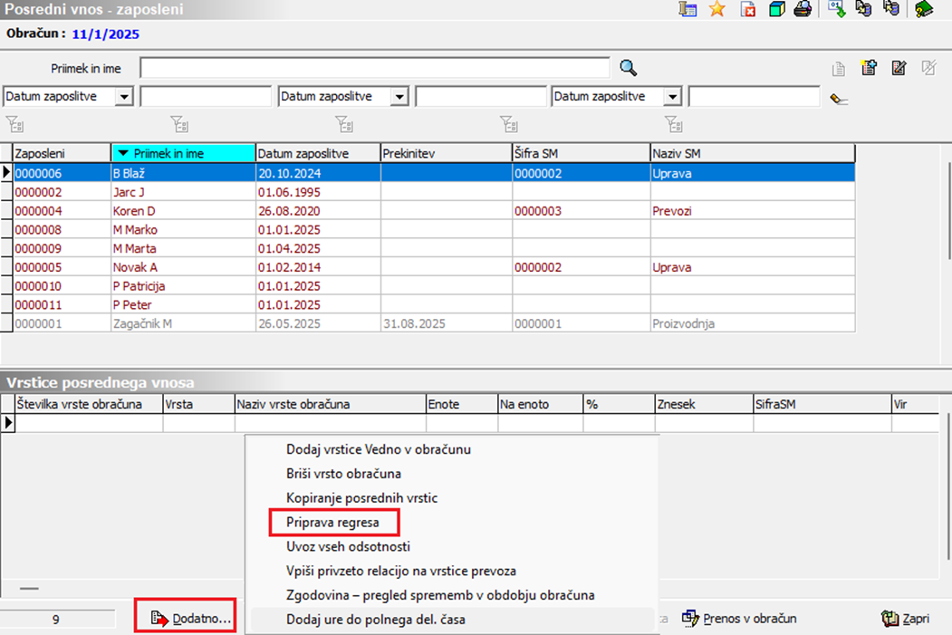 Obračun plač… Posredni vnos…gumb Dodatno ter nato izberete Priprava regresa.